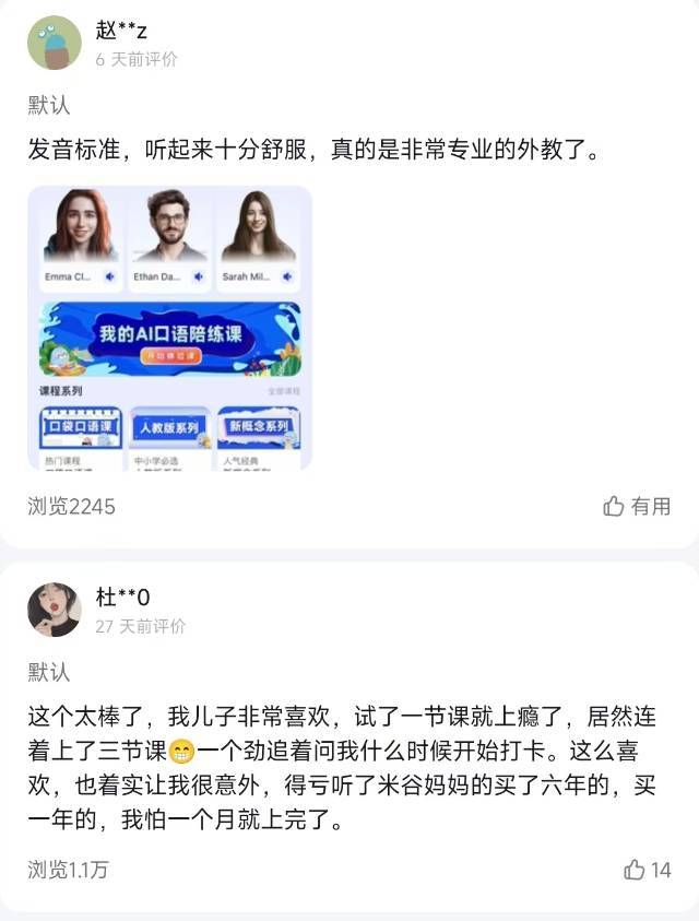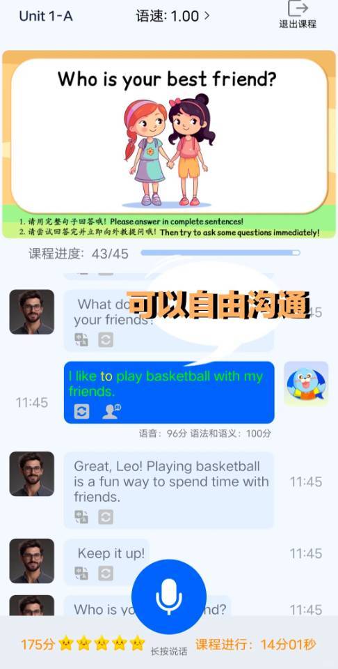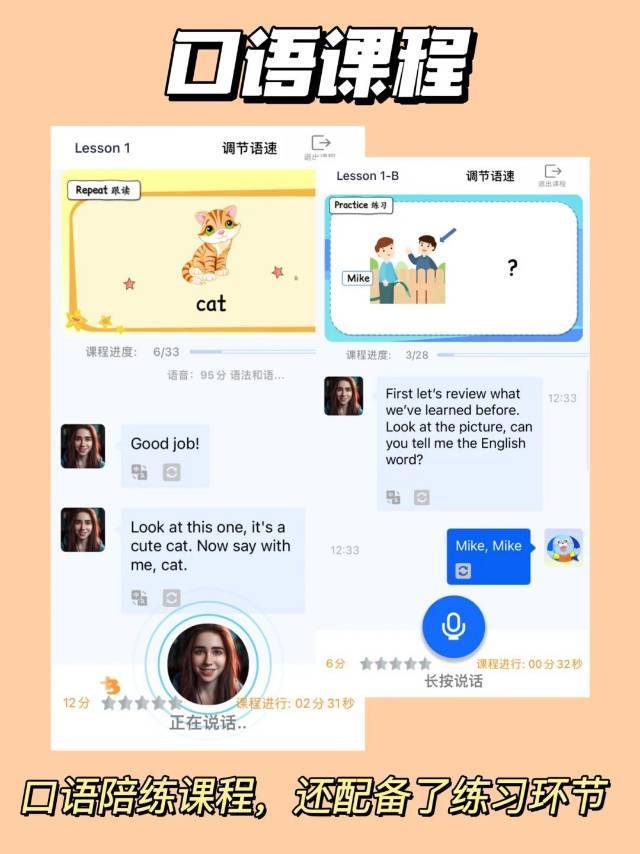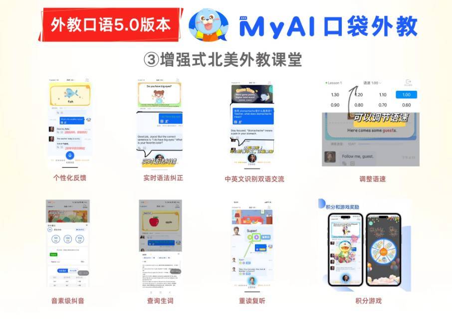 这个课的亮点真的非常非常多,MyAI口袋外教就完全打破了这些限制,标准地道的发音,高强度、高频次、全年无休的优质教学服务,让孩子每天都能和线上AI北美外教练口语,帮助孩子摆脱“哑巴英语的困扰。