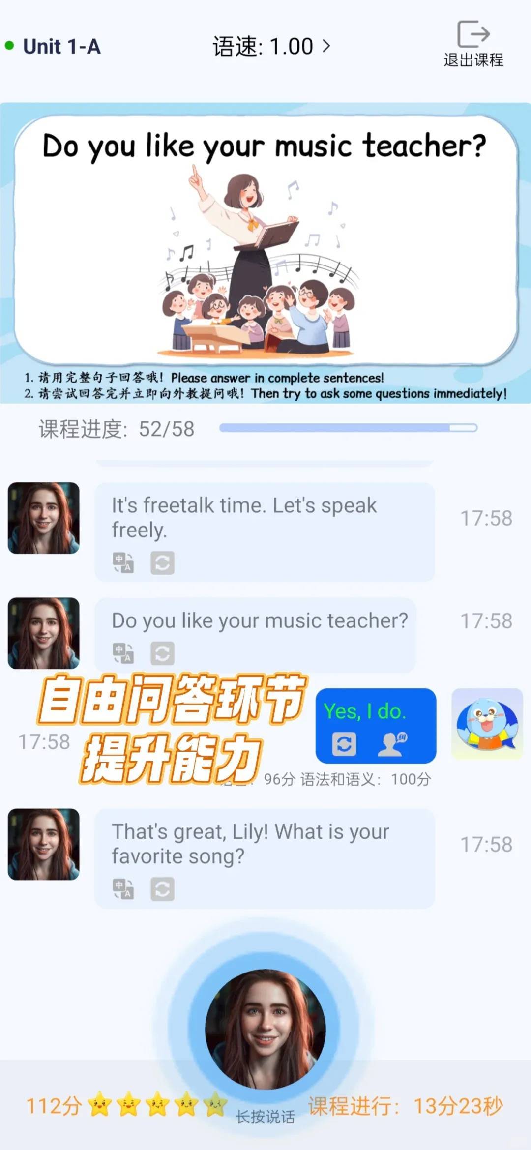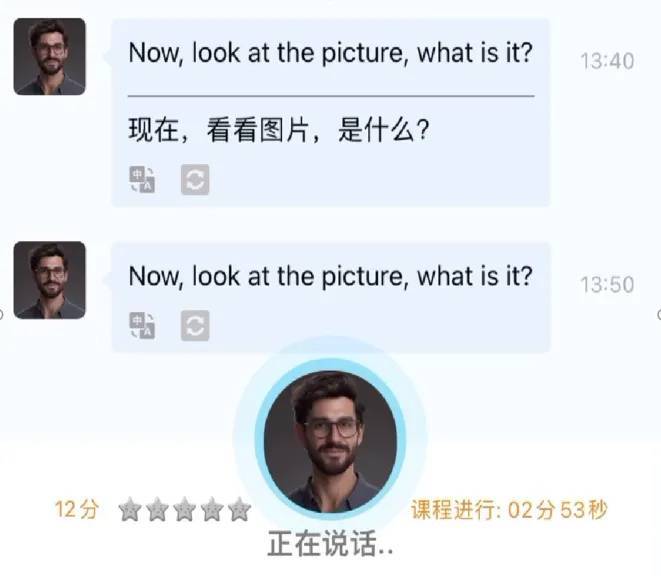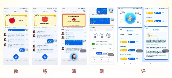 它的课程教学严格科学教学逻辑,采用教学+自由聊天二合一的模式,先学后聊,先输入后输出,形成了教-练-演-测-评完善的学习闭环。