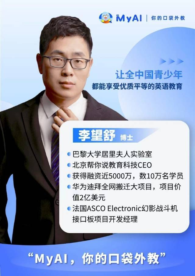 CEO李望舒博士这些年来一直致力于在线外教项目,为10万+家庭提供了优质的外教服务,同时积累了数十万的真人外教语料,通过海量真实教学数据的训练,成功复刻了北美真人外教的教学体验推出了MyAI口袋外教,大大提升了学生的口语学习效率