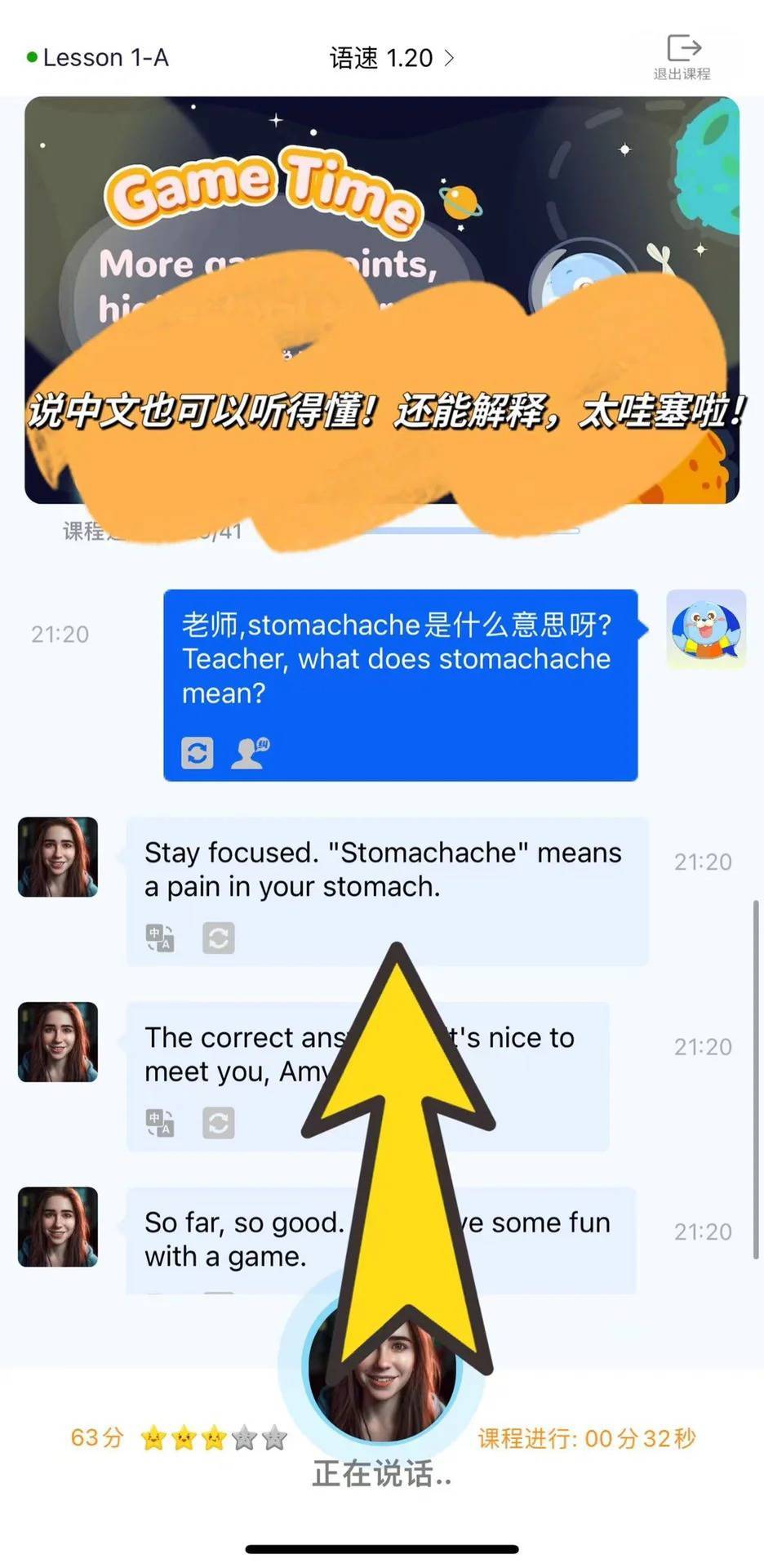 一节课后收获详细的学习报告,包括语义正确率、发音正确率等关键指标全面记录,数据驱动的专业化评语,帮助孩子查漏补缺。已上课程还能查看聊天记录,方便随时复习巩固。▼