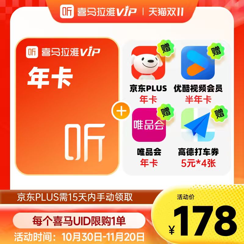 【新-买1得5】喜马年+京东plus年+优酷半年+唯品会年卡+高德5元*4张打车券