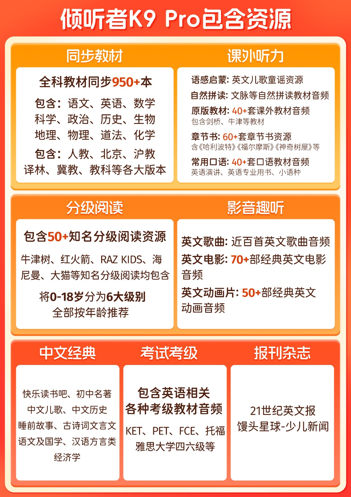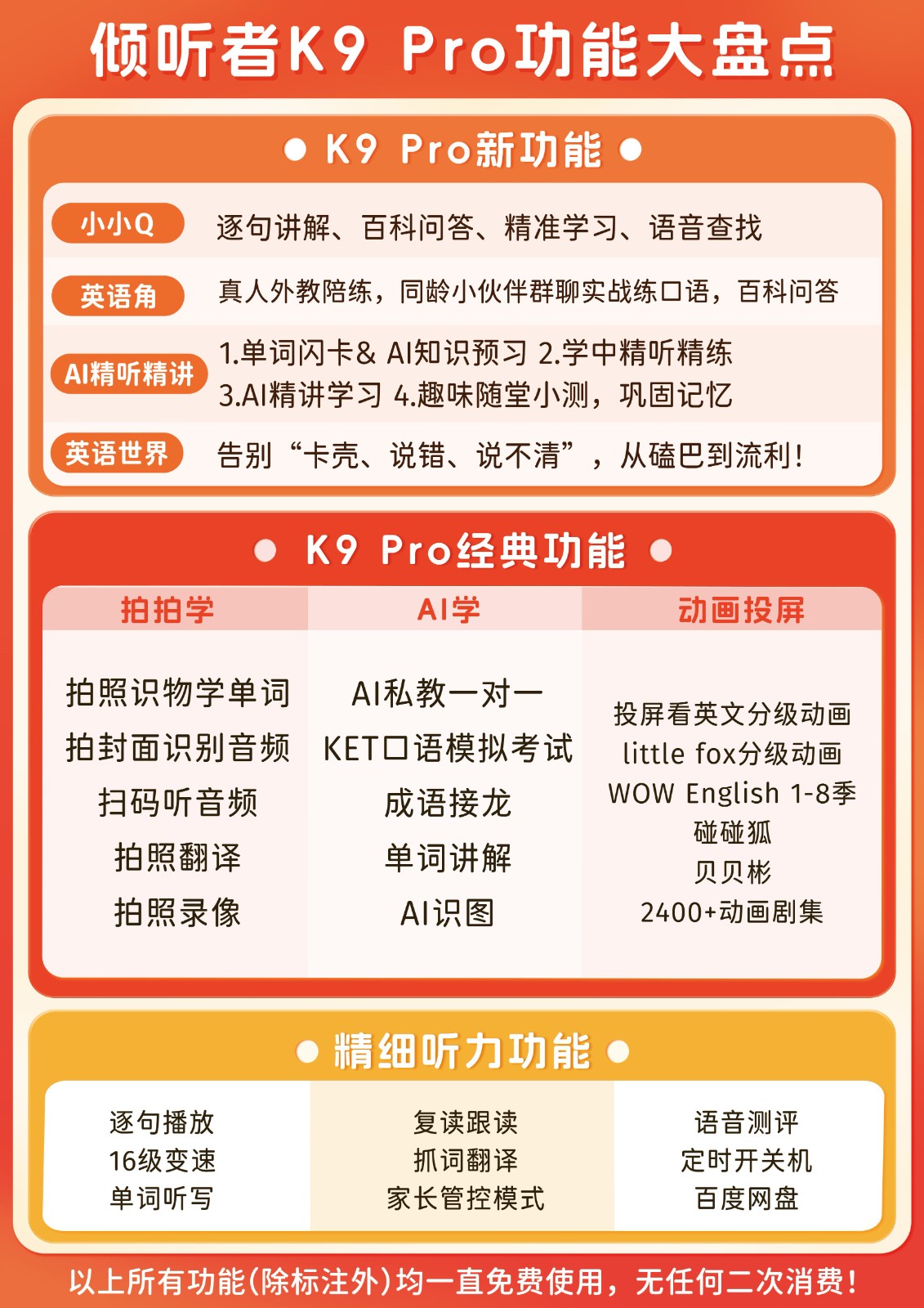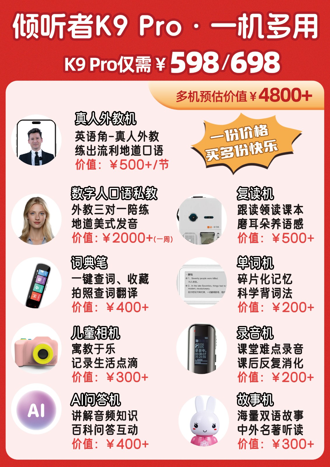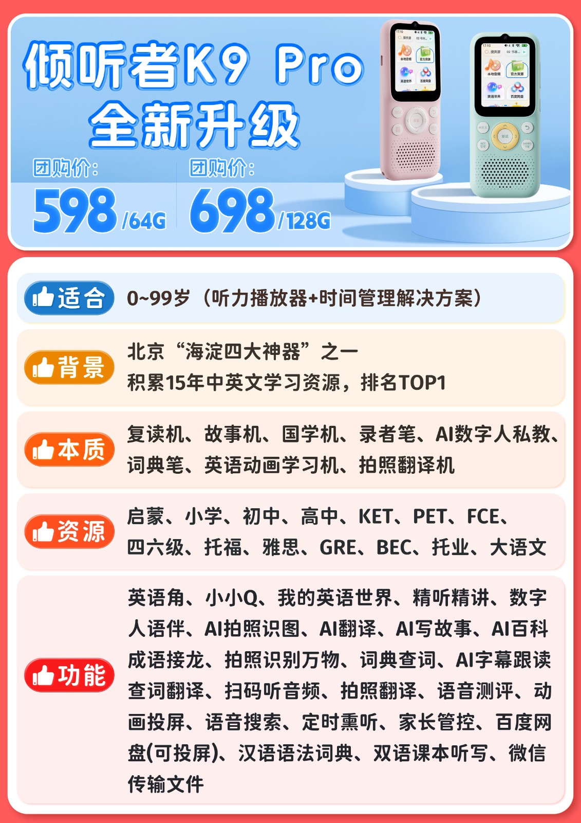 2025听力机天花板来了!🔥倾听者K9Pro !💥硬件软件猛升级,资源狂加量,🎉价格1毛不涨!🔥开学季提分神器!✨海淀妈妈圈疯抢!AI精听精讲+真人外教对话,让孩子英语成绩暴涨!💯📚950+教材同步!单词一本通关,听写自动批改!🎧听力、口语、阅读一机全搞定!🎀新学期逆袭就靠它!⚠️首发特惠价!👉让孩子甩开同龄人!