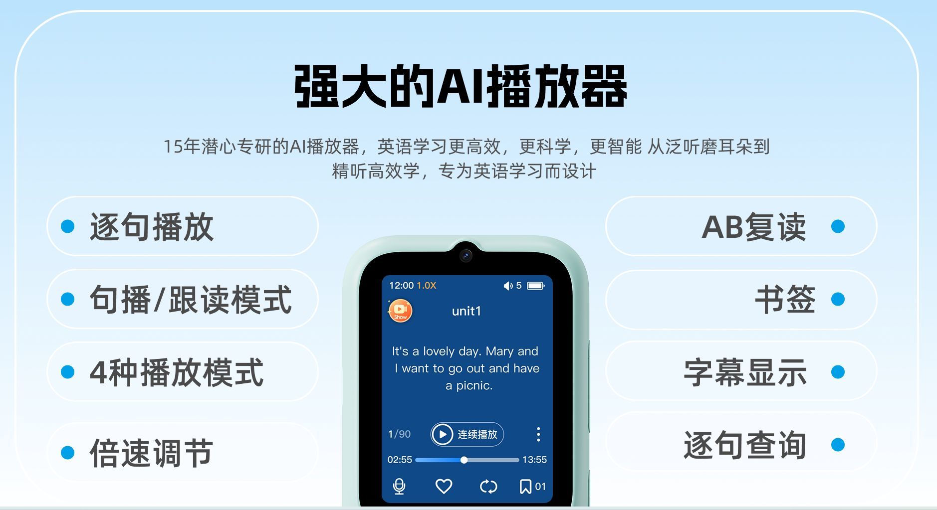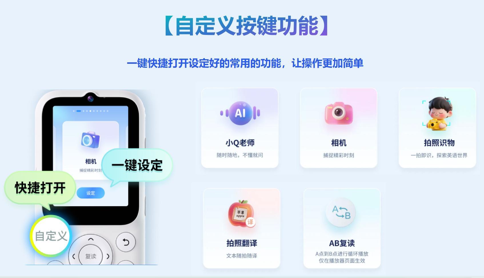 AB复读键升级为自定义键:可设拍照识物、拍照翻译或一键唤醒AI小小Q,高频功能秒启动,操作更简单。