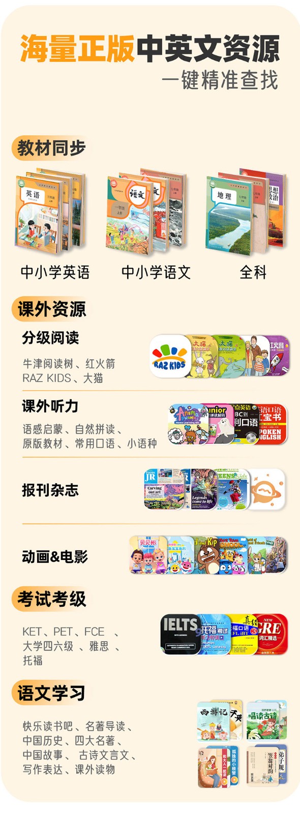 英语资源从语感启蒙、自然拼读、分级阅读、章节书、英文名著音频、电影动画片音频,到KET、PET、托福雅思、大学四六级等各类考级教材音频,一应俱全,免费听。