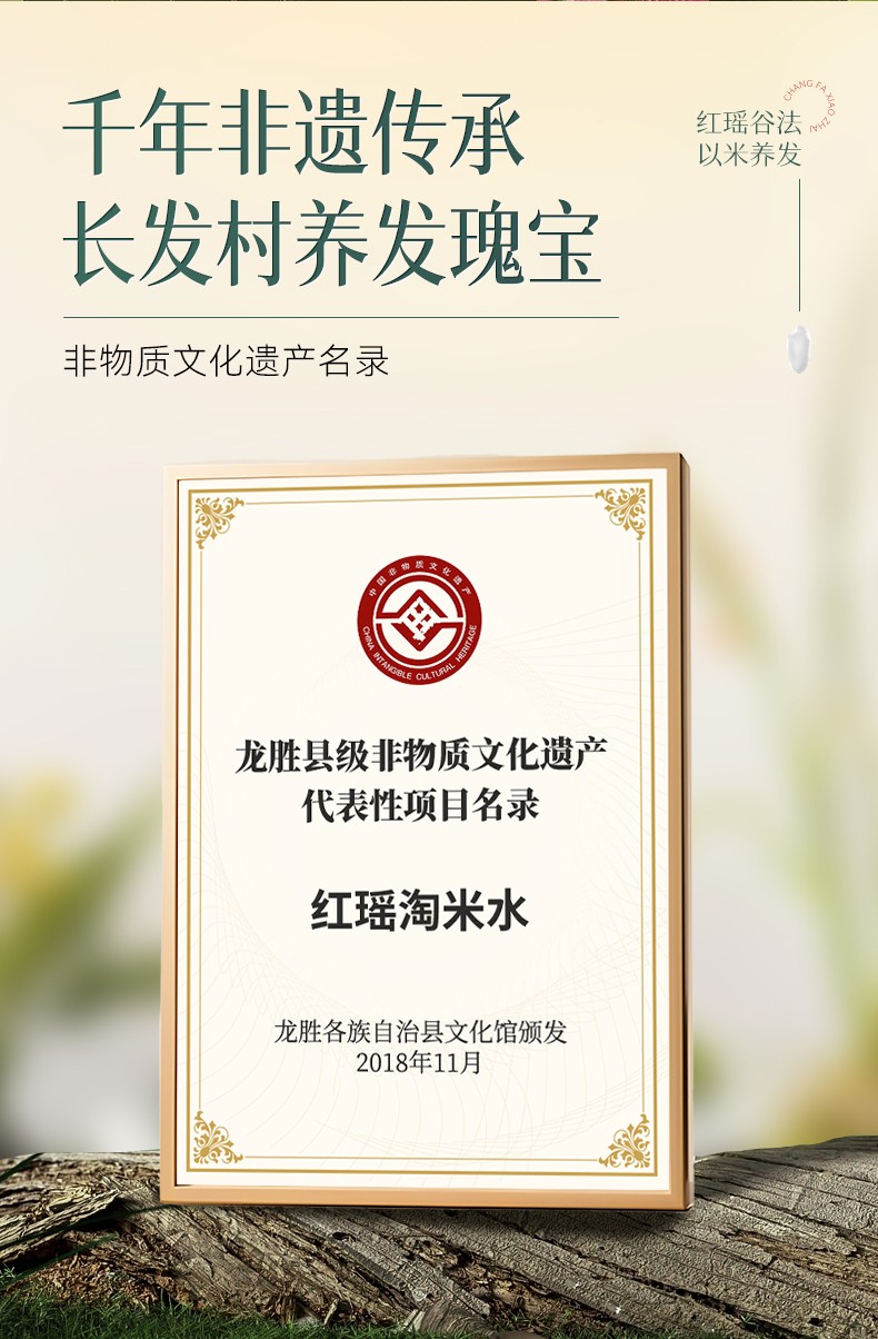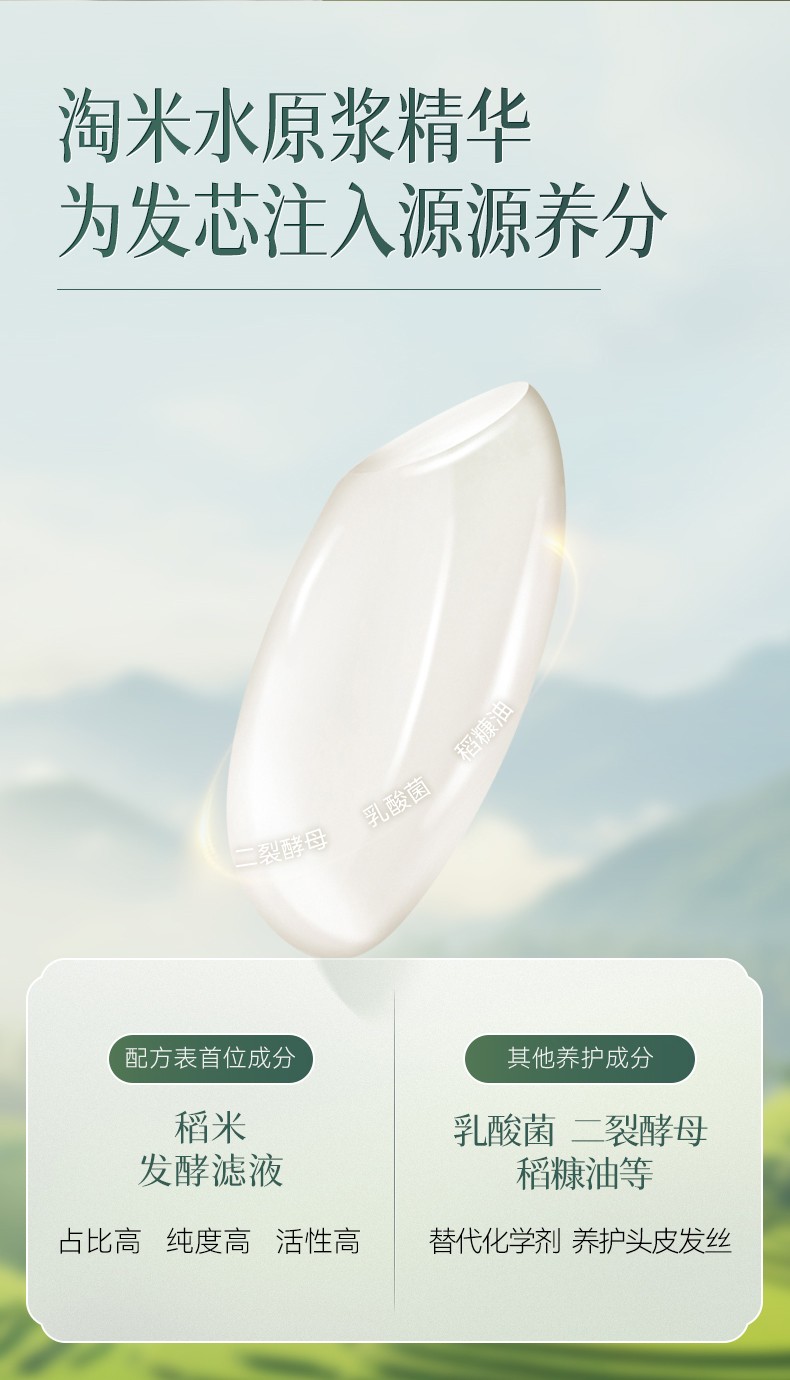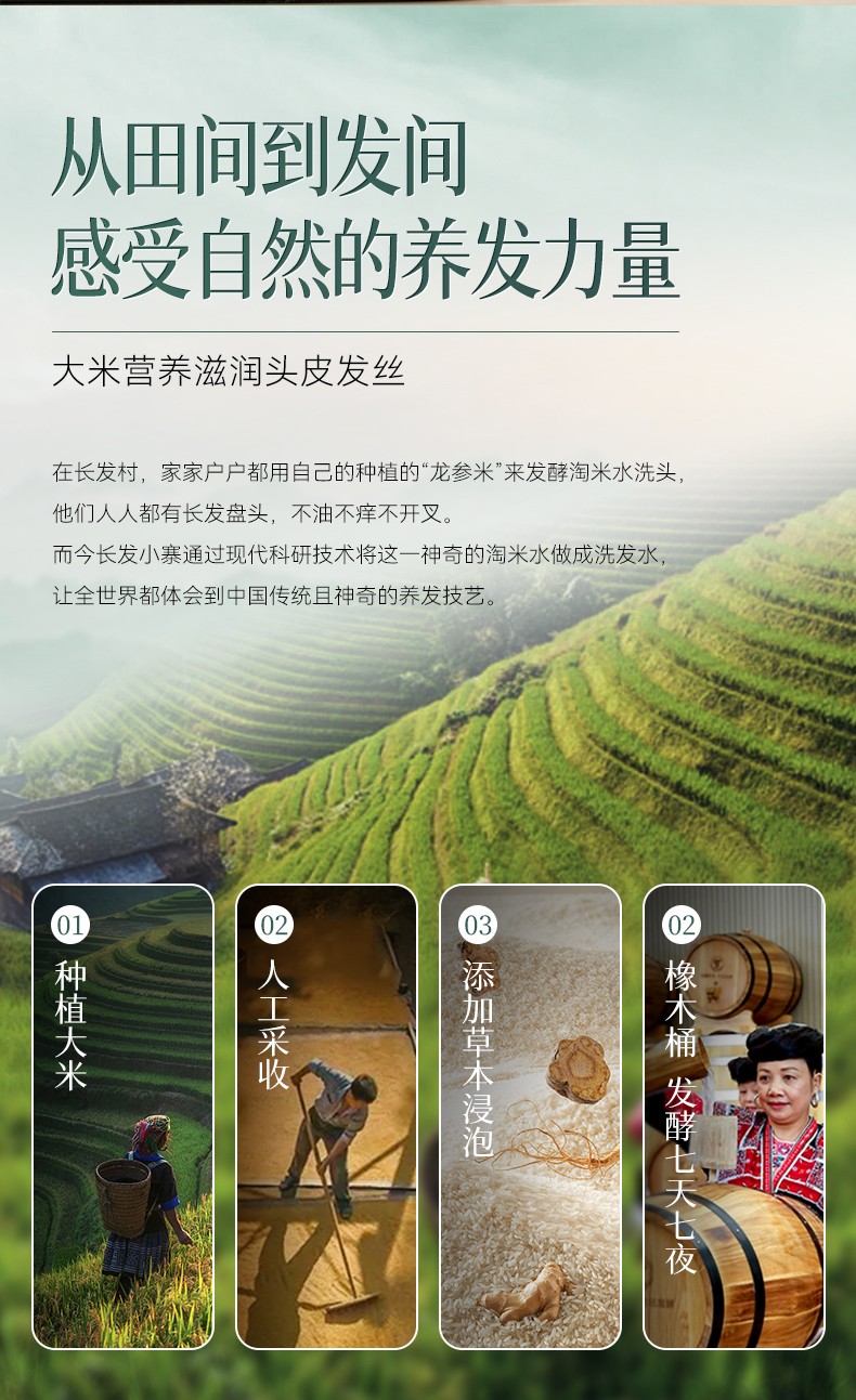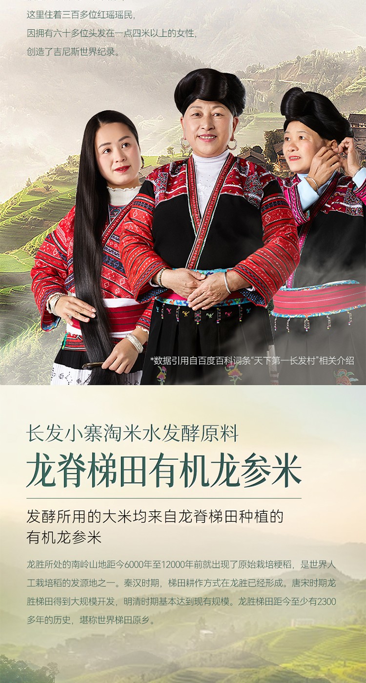 成分表首位为龙脊梯田土壤孕育而成“稻米发酵滤液”。 丰富的角蛋白精华和二裂酵母乳酸菌营养及何首乌提取物