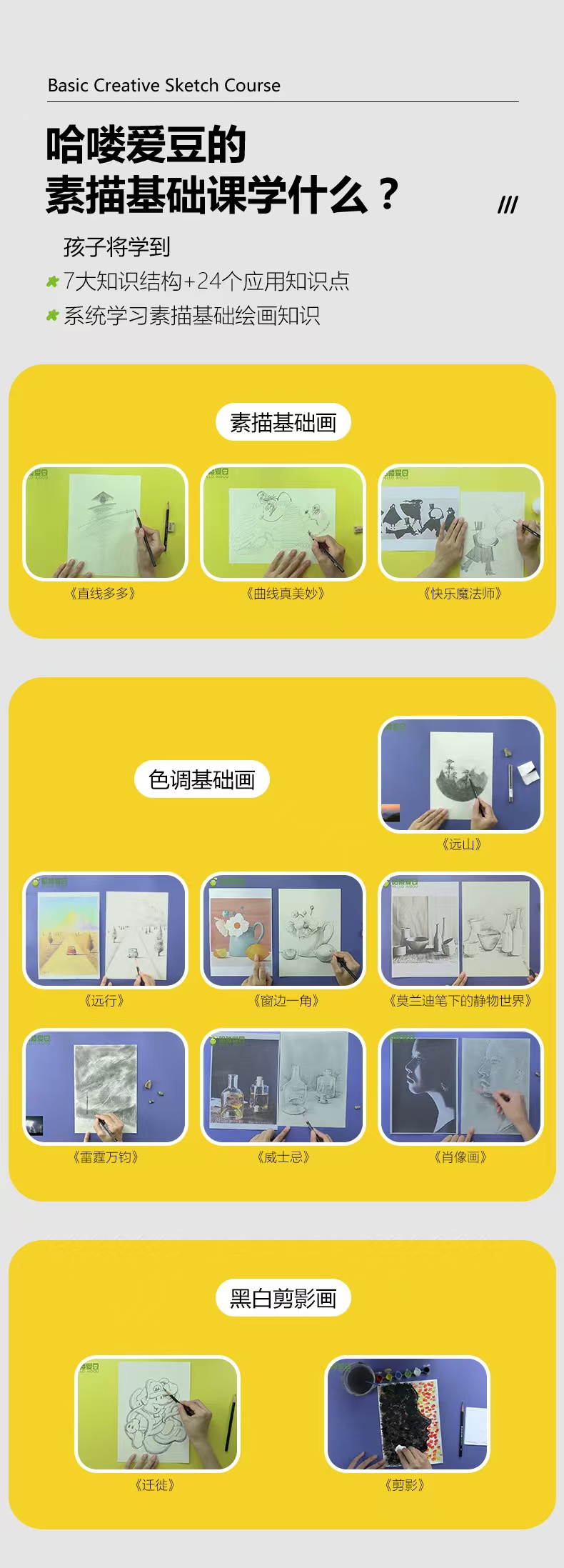 双十一超级福利活动,买课赠课,哈喽爱豆 素描零基础艺术课-中考必备系列 适合7岁+的小朋友 赠送全套绘画礼盒,送油画大师课视频16节+送精品水粉课视频24节+送30张16开绘画纸+送立体摆台画2幅