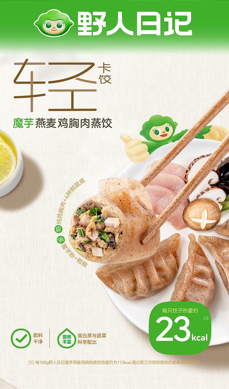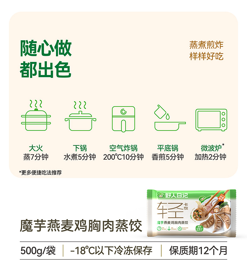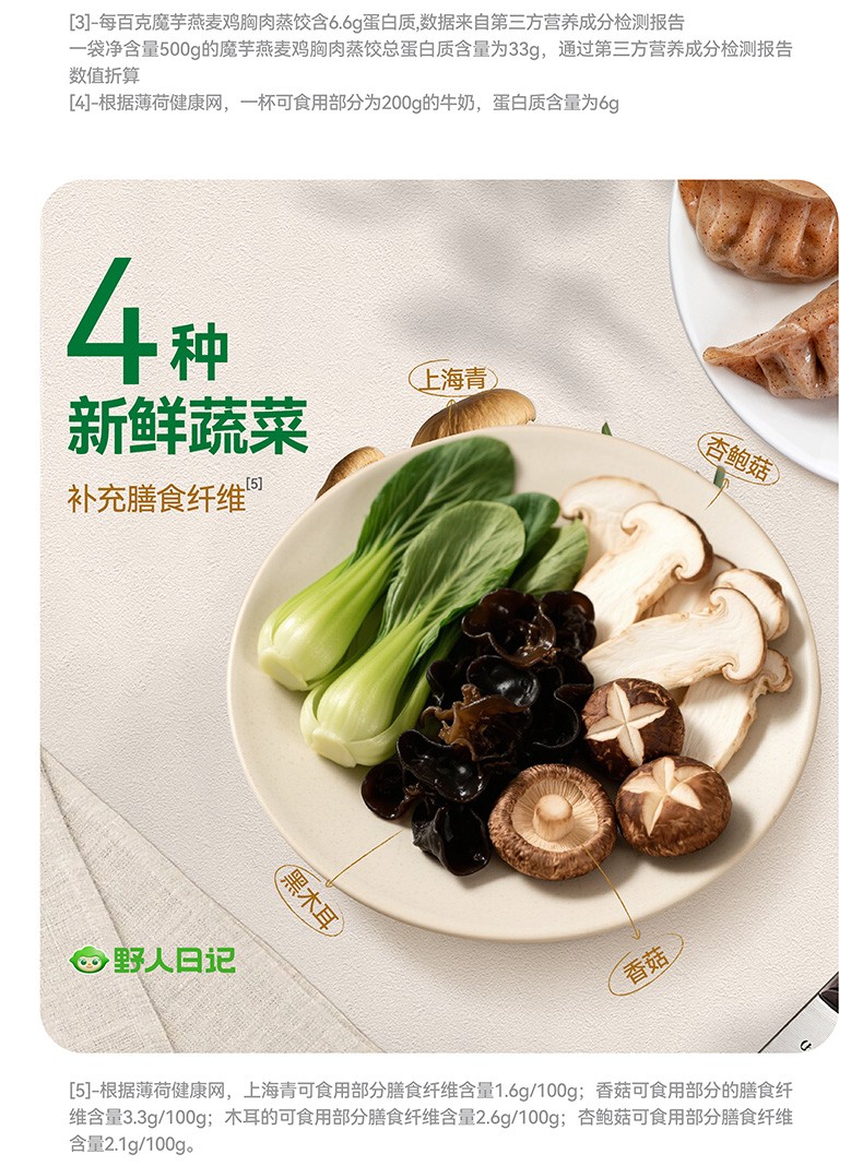 野人日记魔芋燕麦鸡胸肉蒸饺500g/袋,低脂低卡健康早餐优选~比普通饺子热量减半!吃着放心,不担心长胖!重点是很好吃!健康,美味,我都要!