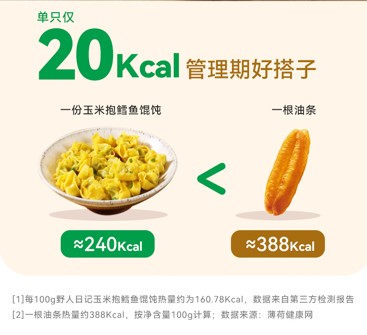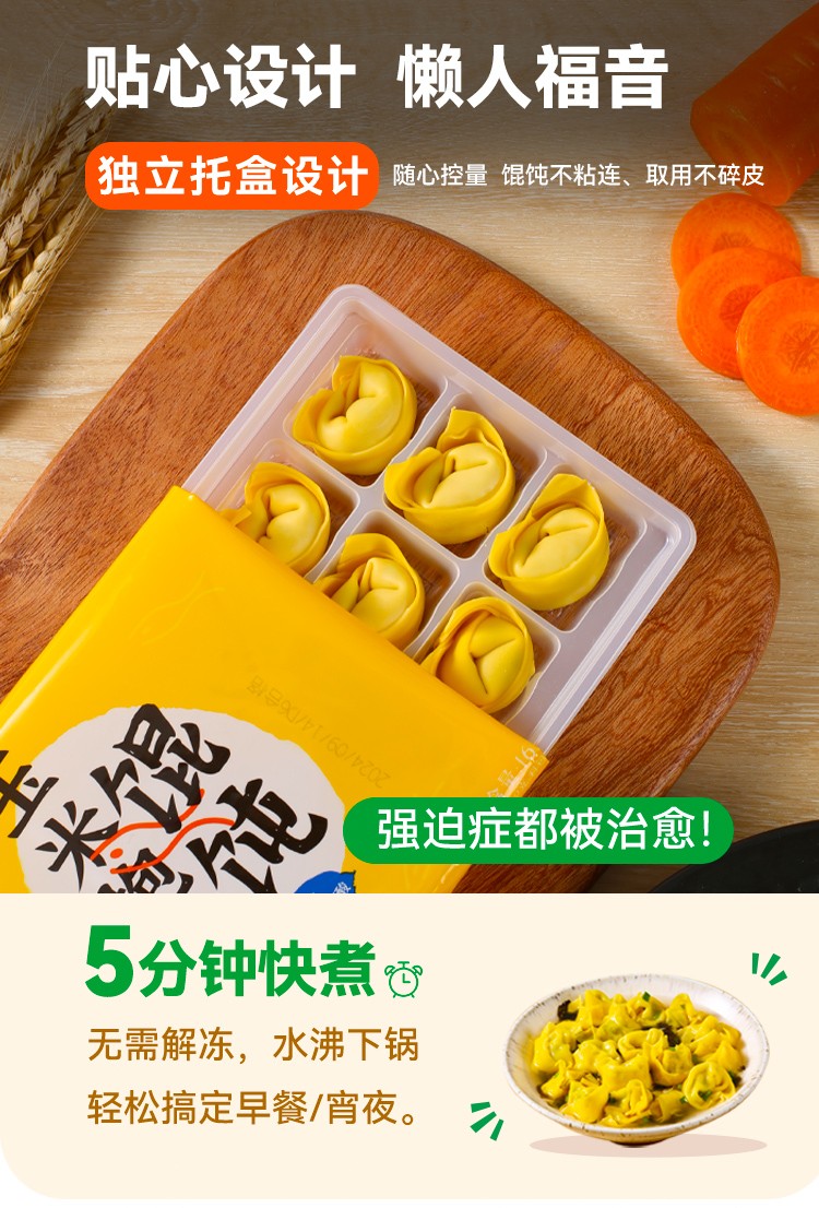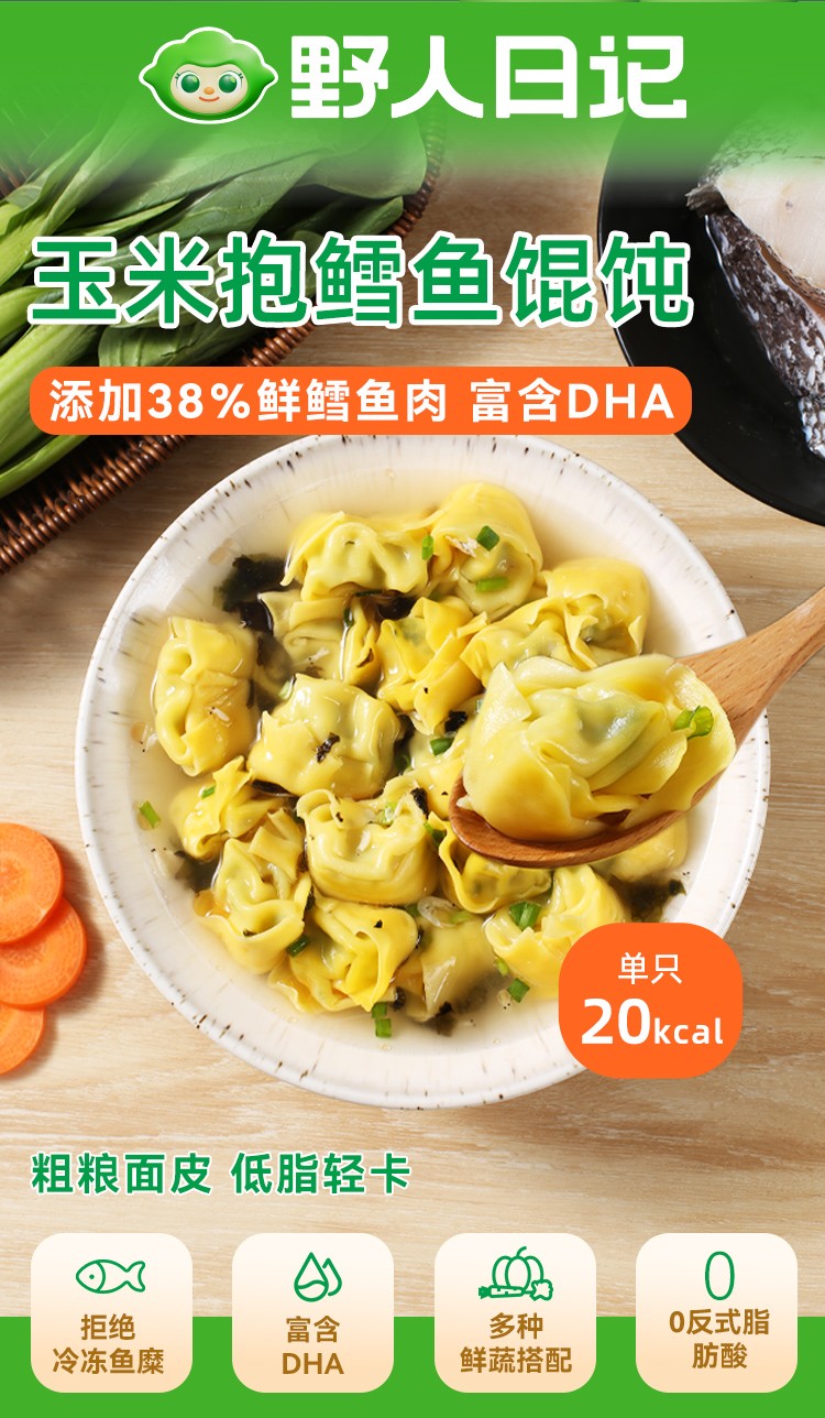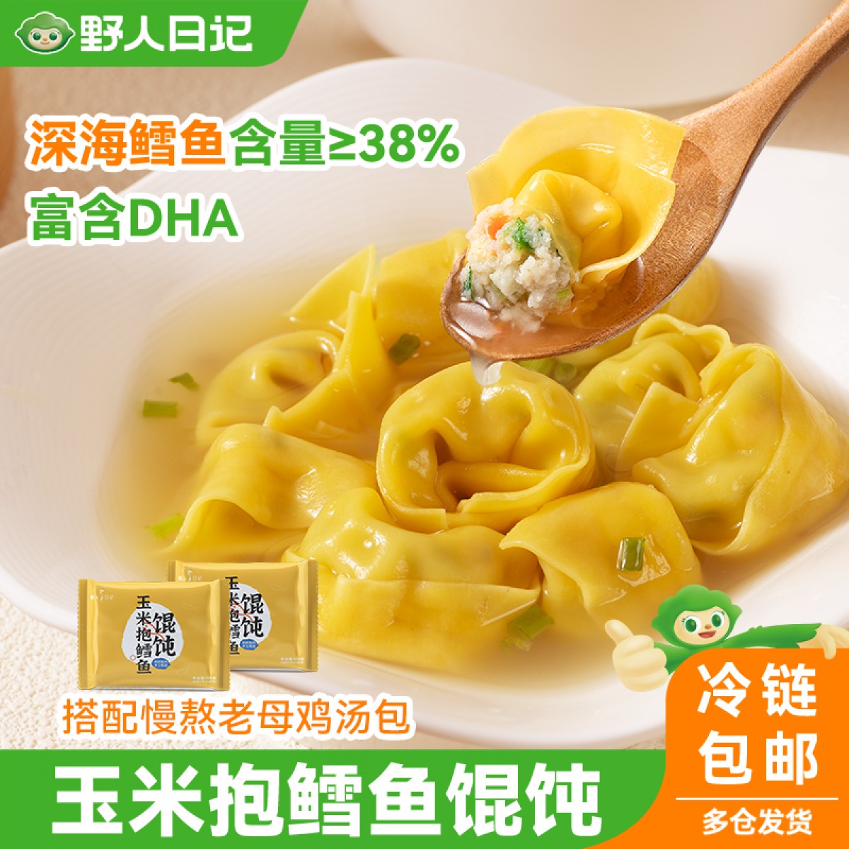 野人日记玉米抱鳕鱼馄饨 160g/袋,5袋装!深海鳕鱼含量≥38%,富含DHA,拒绝冷冻鱼糜,只用鲜鳕鱼