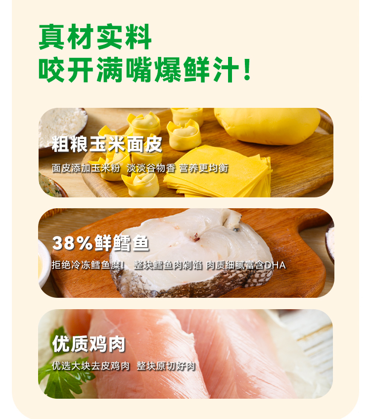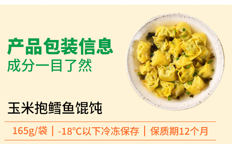 商品名称:野人日记玉米抱鳕鱼馄饨 160g/袋,5袋装!深海鳕鱼含量≥38%,富含DHA,拒绝冷冻鱼糜,只用鲜鳕鱼