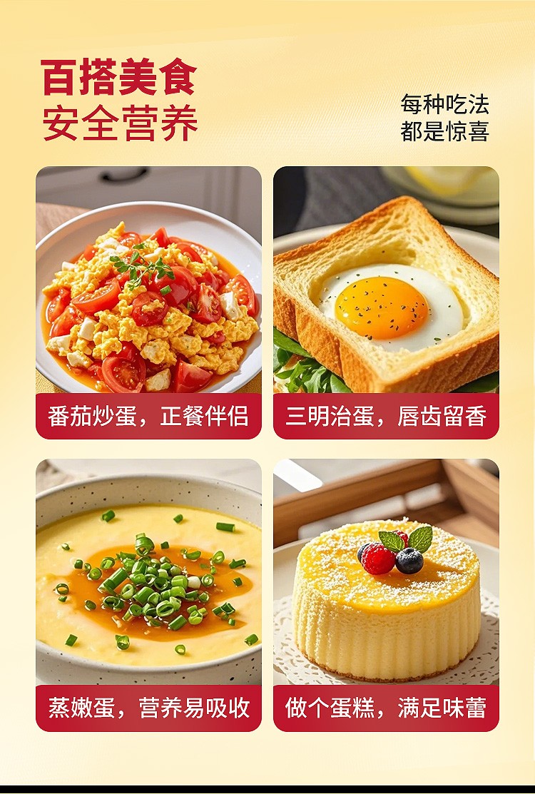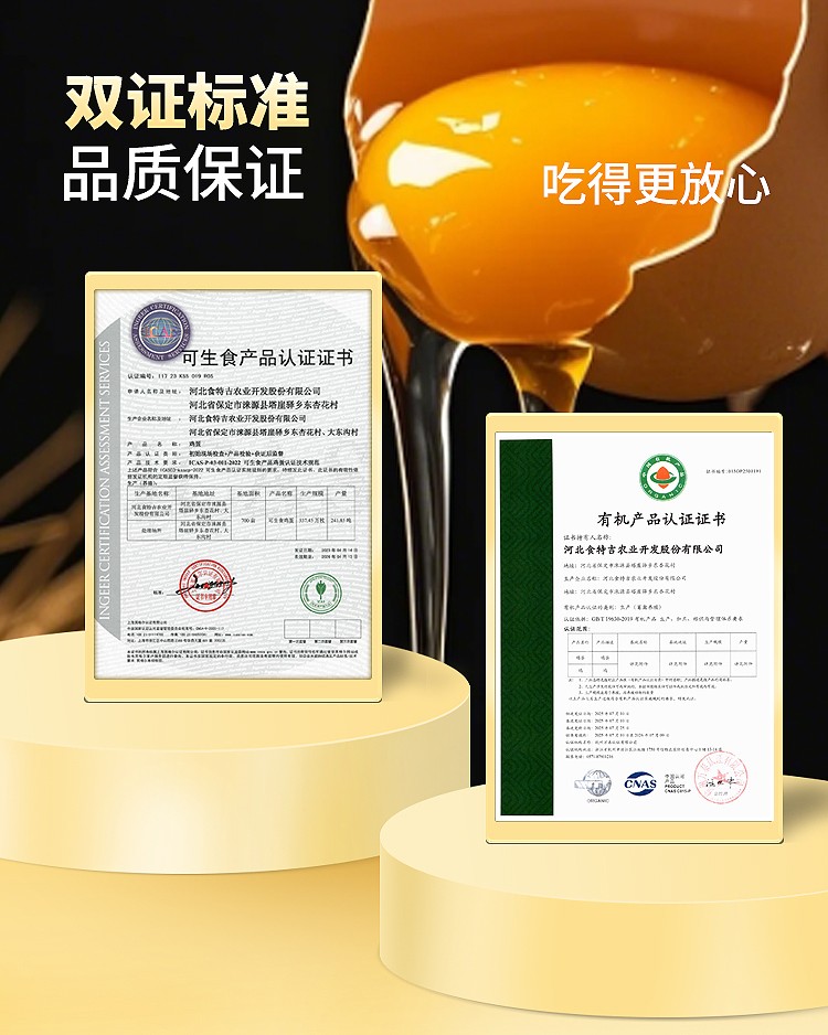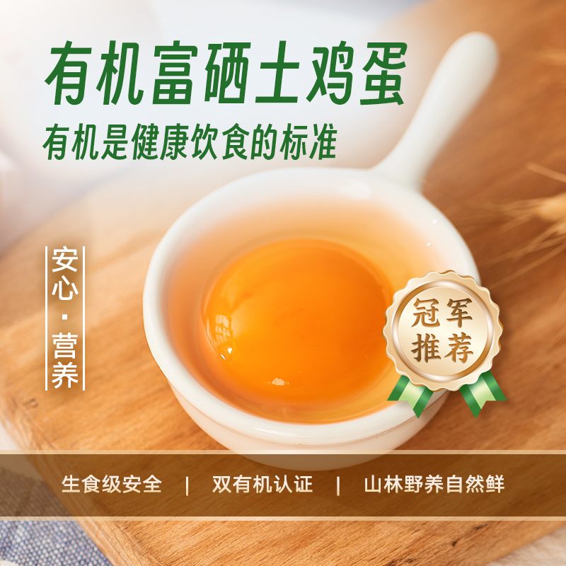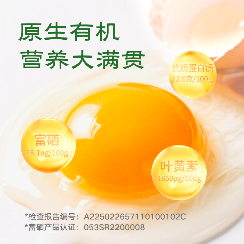 有机、富硒多重认证,不含沙门氏菌可生食。食用有机谷物、纯粮饲养,无抗,无色素,无农残。