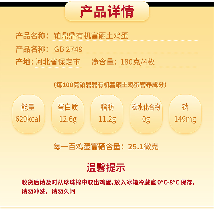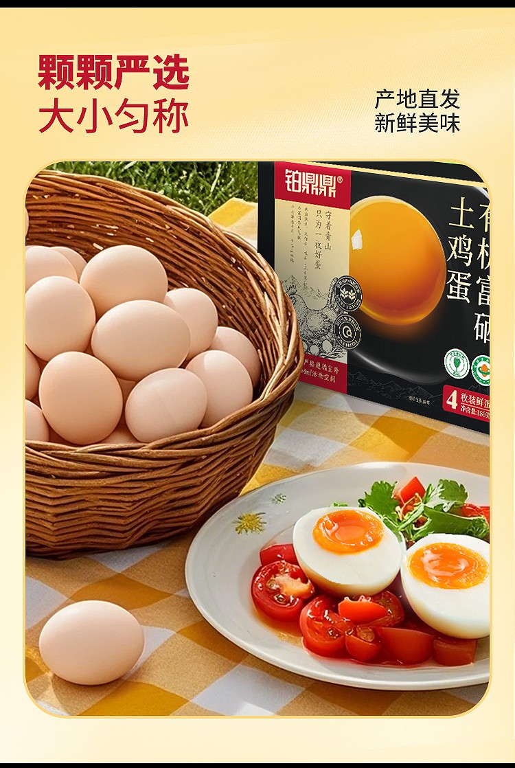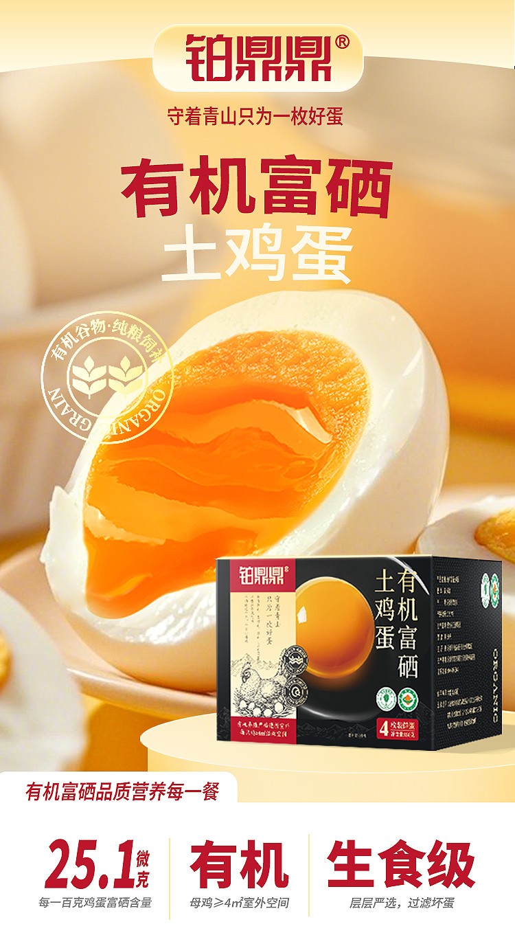 商品名称:铂鼎鼎有机富硒土鸡蛋4枚试吃装 净重180g