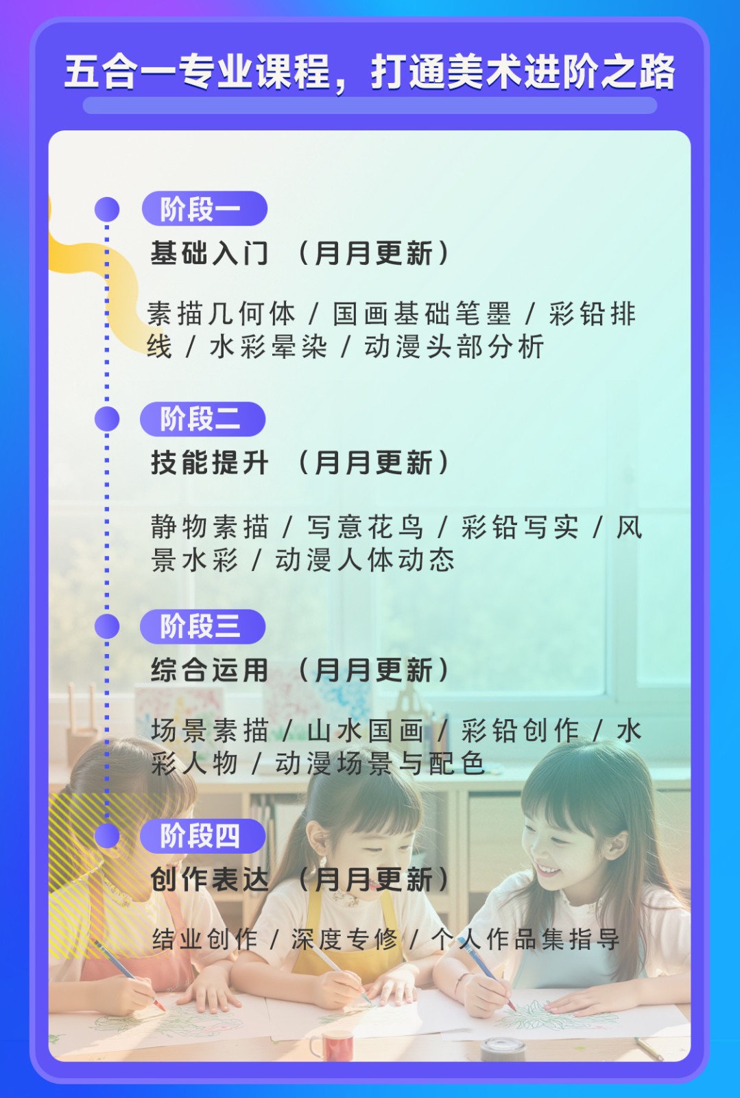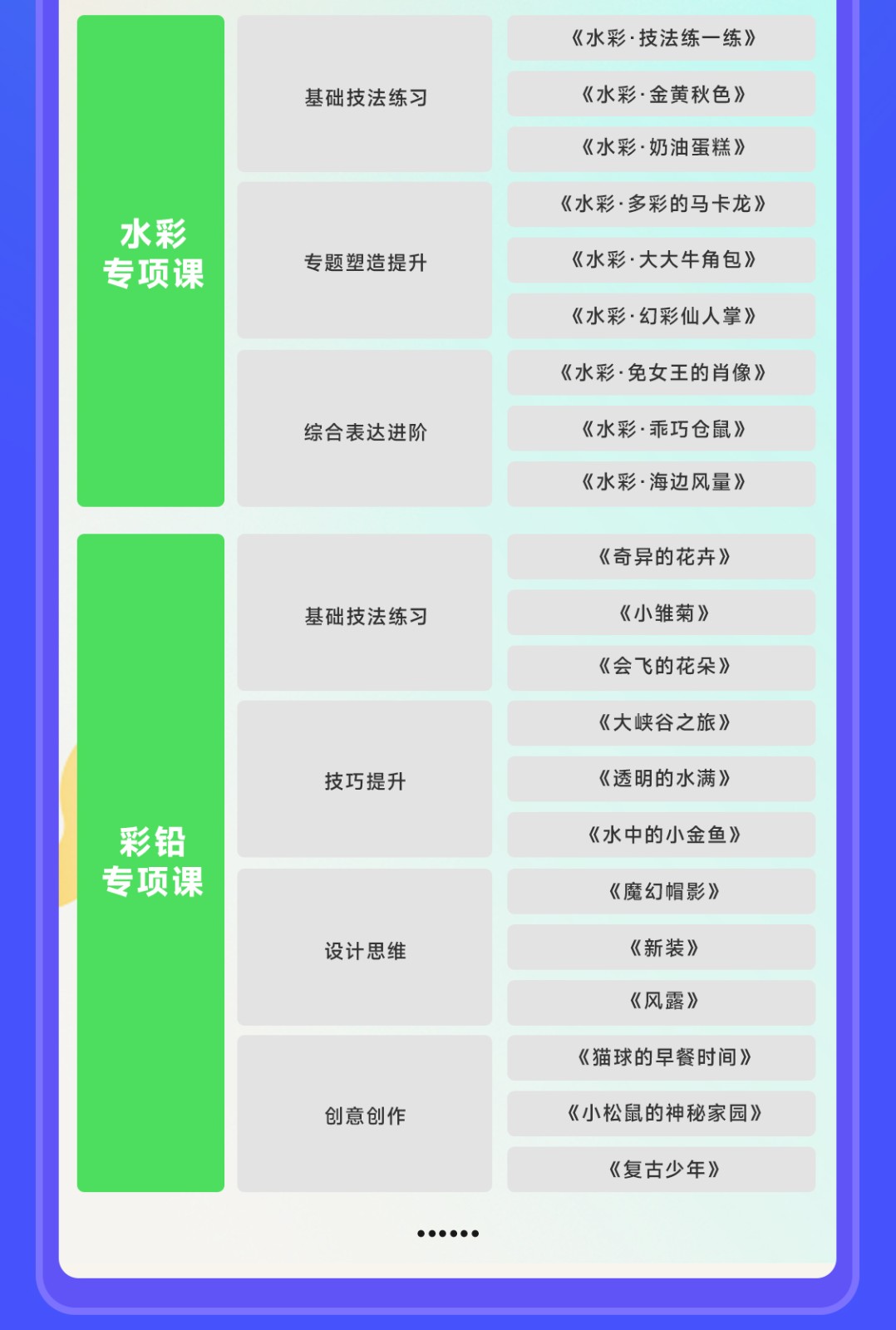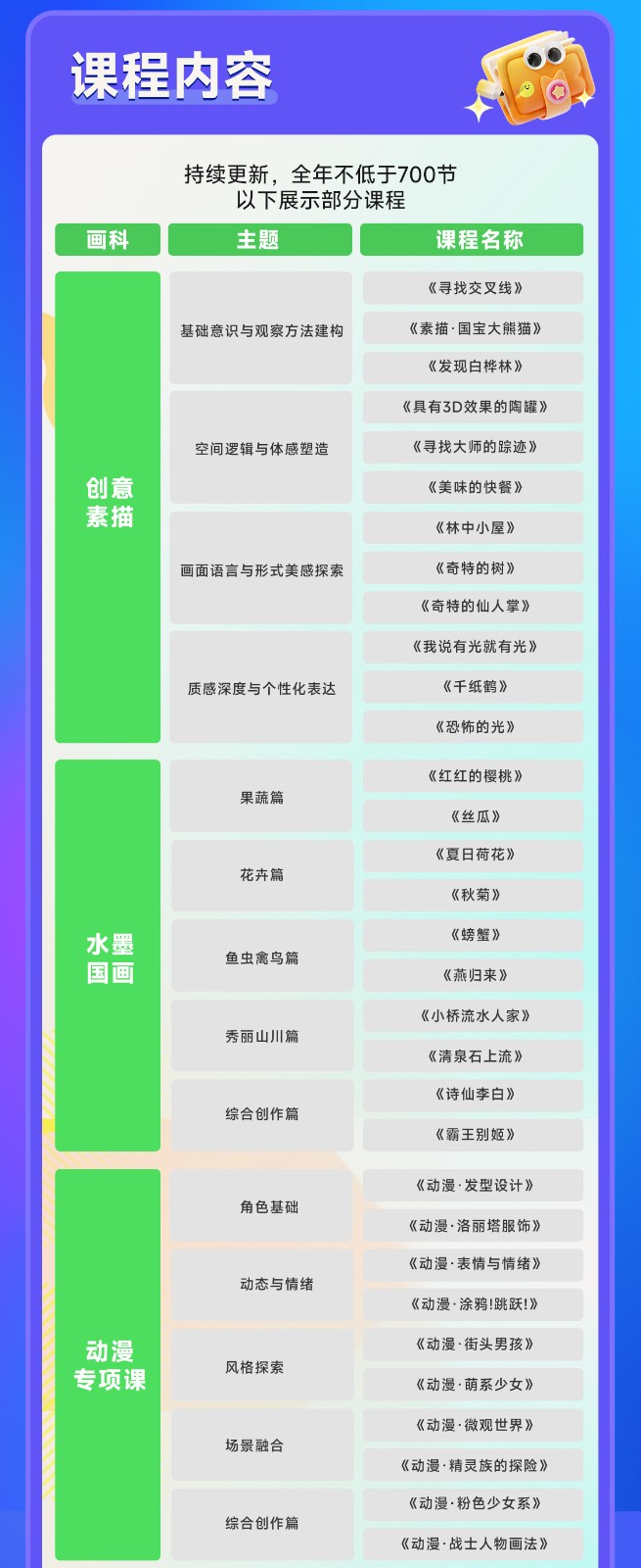 持续更新,全年至少700节课,孩子学不腻!包含6大课程:✅创意素描✅水墨国画✅动漫✅水彩✅彩铅