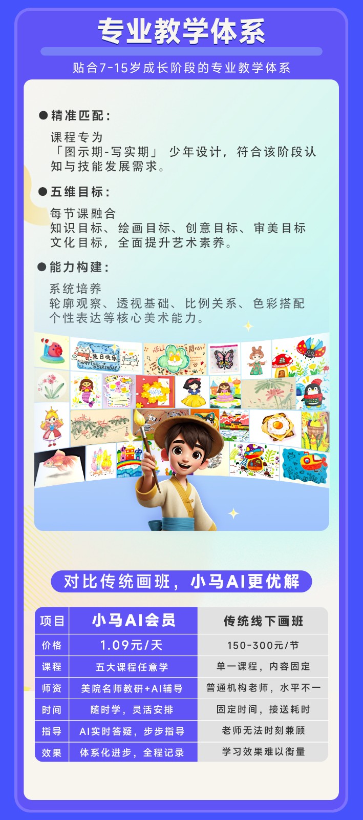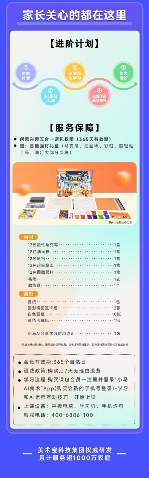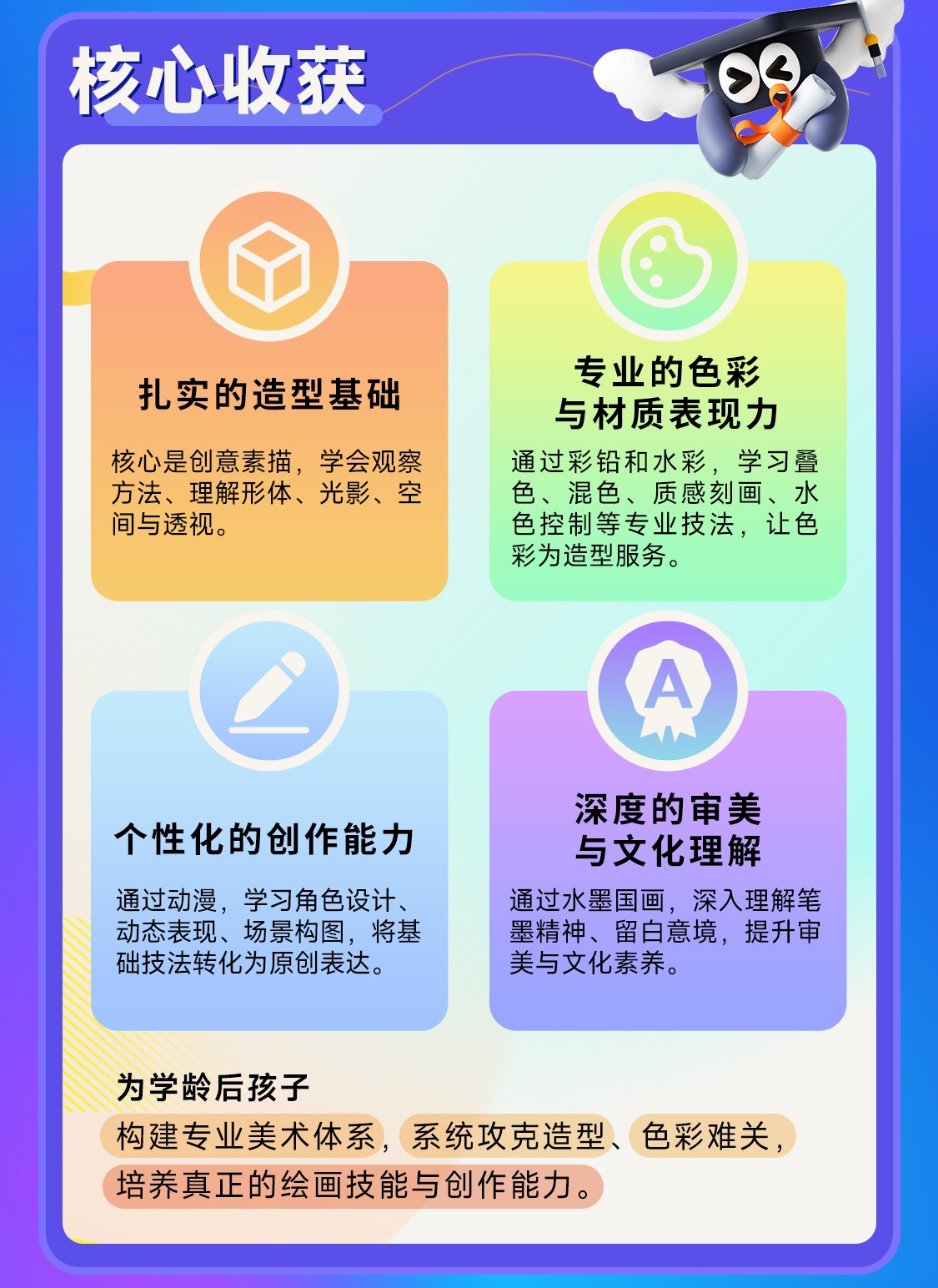持续更新,全年至少700节课,孩子学不腻!包含6大课程:✅创意素描✅水墨国画✅动漫✅水彩✅彩铅