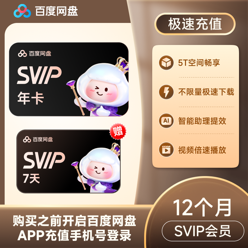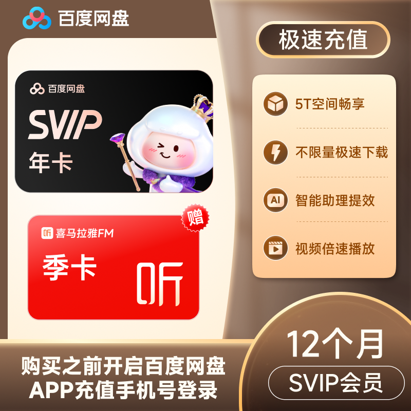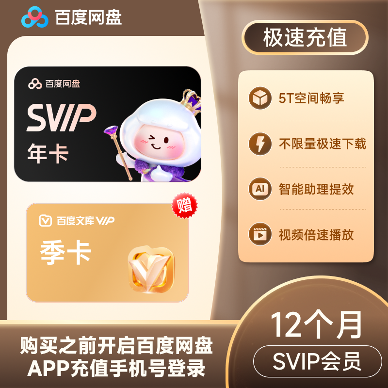 ⚠ 充值说明:下单请正确填写已绑定APP的手机号;同一个账号之前开通过会员,会自动顺延有效期;充值上限为5年,否则充值失败;不同账号之间权益无法互通,下单请核对需充值的账号;非百度旗下会员会通过短信发送兑换码和兑换链接,需手动领取兑换,请收到短信后24小时内激活,避免逾期无法使用,不支持退换;百度网盘会员和赠品仅支持同一手机号充值,不支持换绑账号;