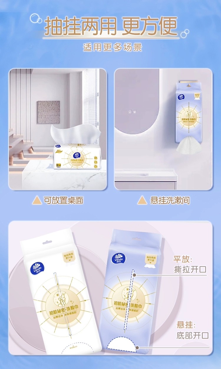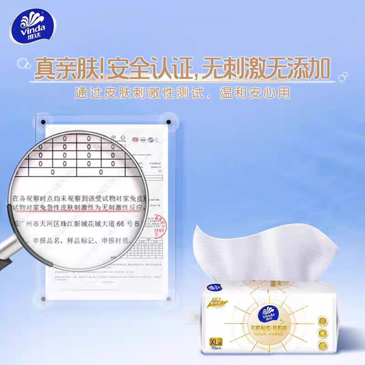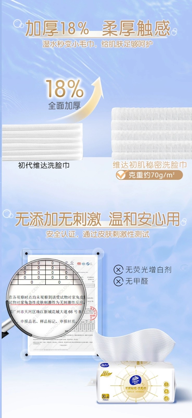 商品名称:【闪购返场】维达初肌秘密洗脸巾可悬挂XL码70抽6提/箱v1170
