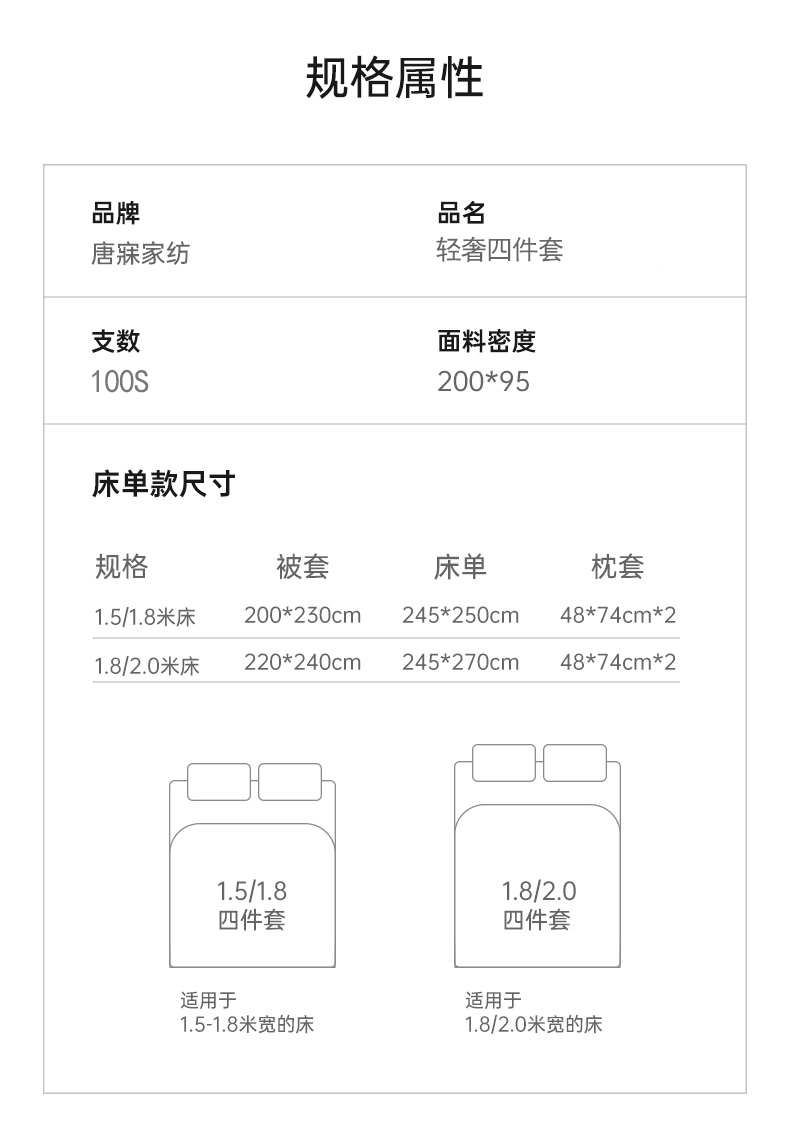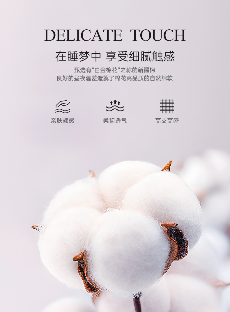 3、100支高支数长绒棉,面料如云朵般软糯贴肤,同时长绒棉的长纤维特性避免粗糙感,,面料表面光泽柔和不刺眼,呈现出自然的“柔光质感”比普通棉更显精致,长绒棉的纤维长度是普通棉的1.5倍以上,反复洗涤后不易起球,变形
