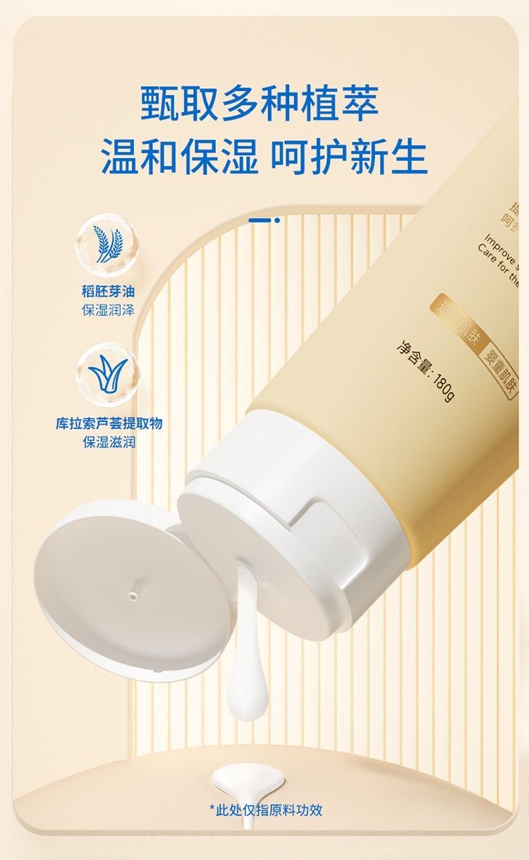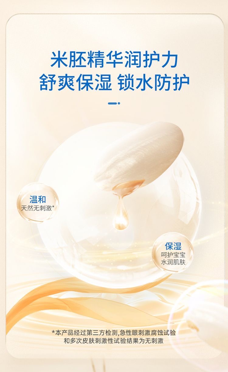 入选京东婴童护肤热卖榜TOP,大团长开团,12年国货品牌,行业内获得多种奖项。 添加米胚芽精华,高保湿+养护肌肤