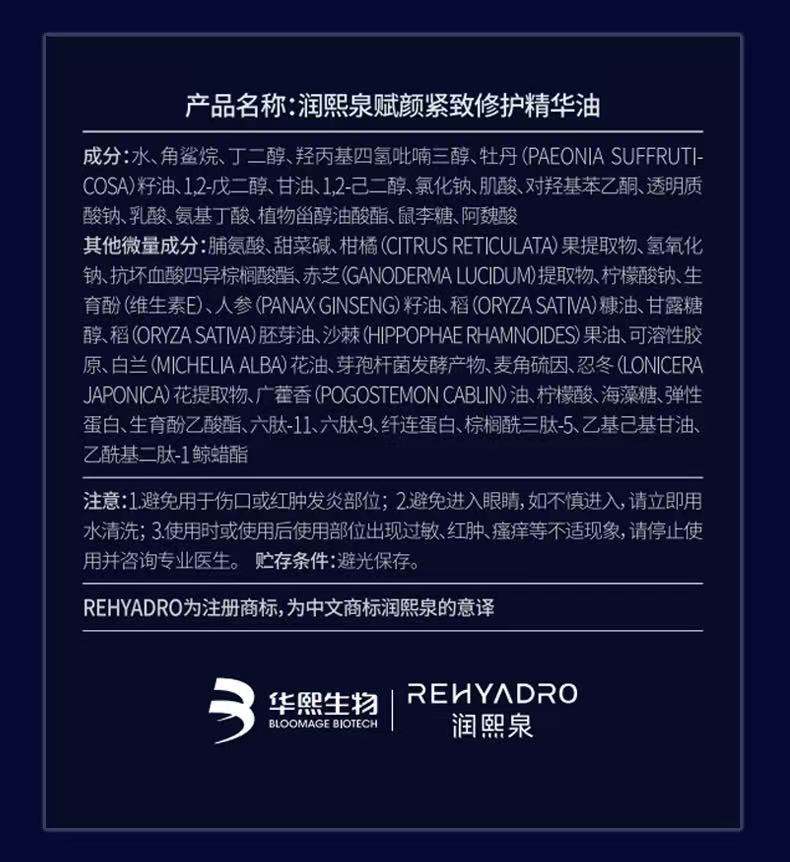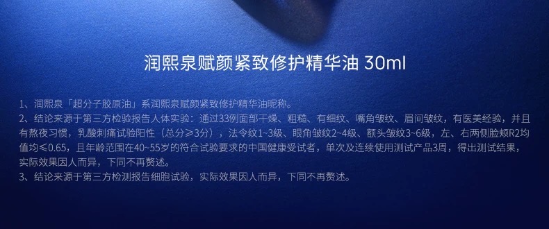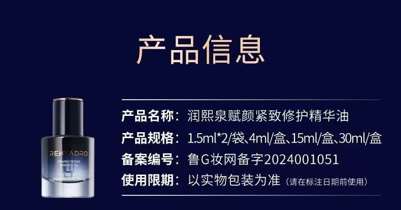商品名称:清仓!润熙泉赋颜紧致修护精华油[30ml/瓶]以油养肤!人参,牡丹,灵芝孢子油,搭配13种冻龄胶原,协同玻尿酸,利用精华油强渗透高吸收,将核心成分直接输送肌底~