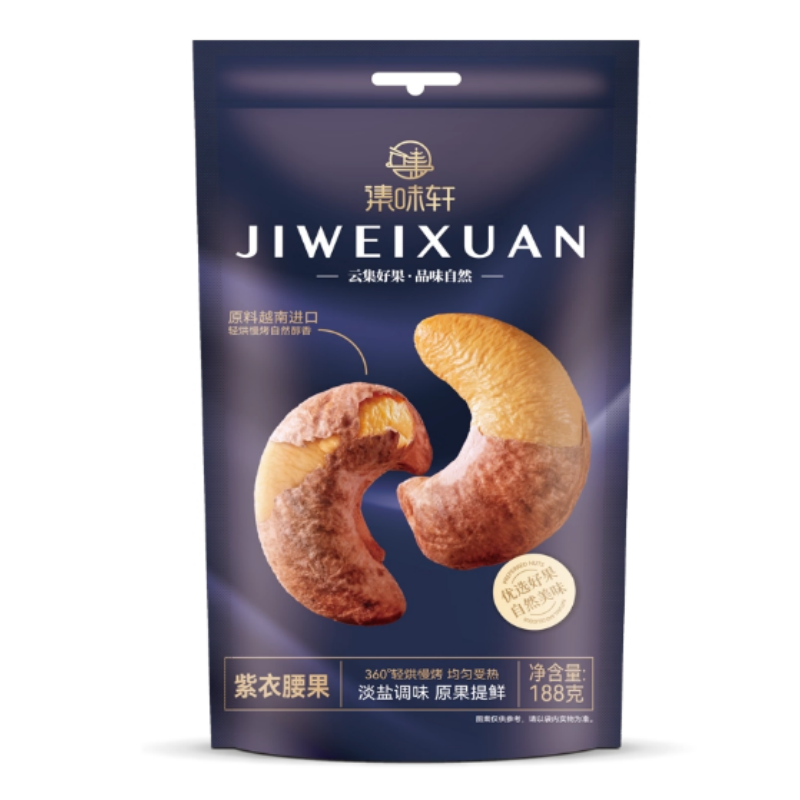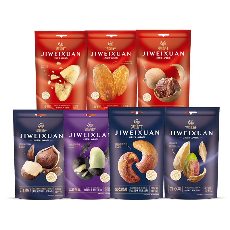 商品名称:集味轩坚果组合(越南紫衣腰果108g 美国开口大榛子108g美国加州开心果108g 五香黑豆188g 泰国龙眼干288g 智利提子干108g香蕉片188g)