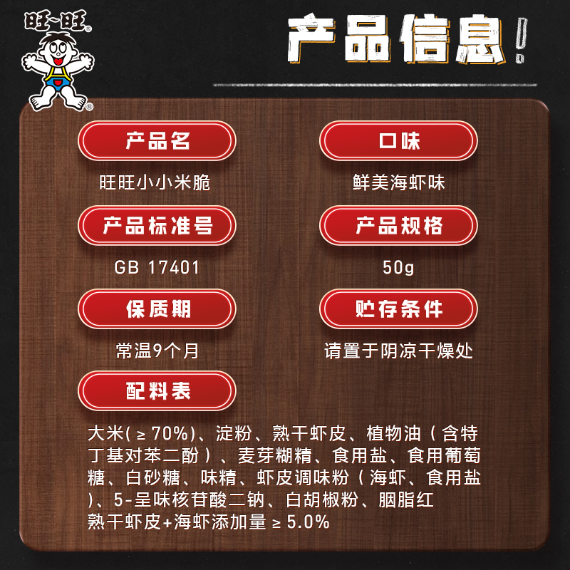 商品名称:【99元任选20件】旺旺小小米脆_50g鲜美海虾味
