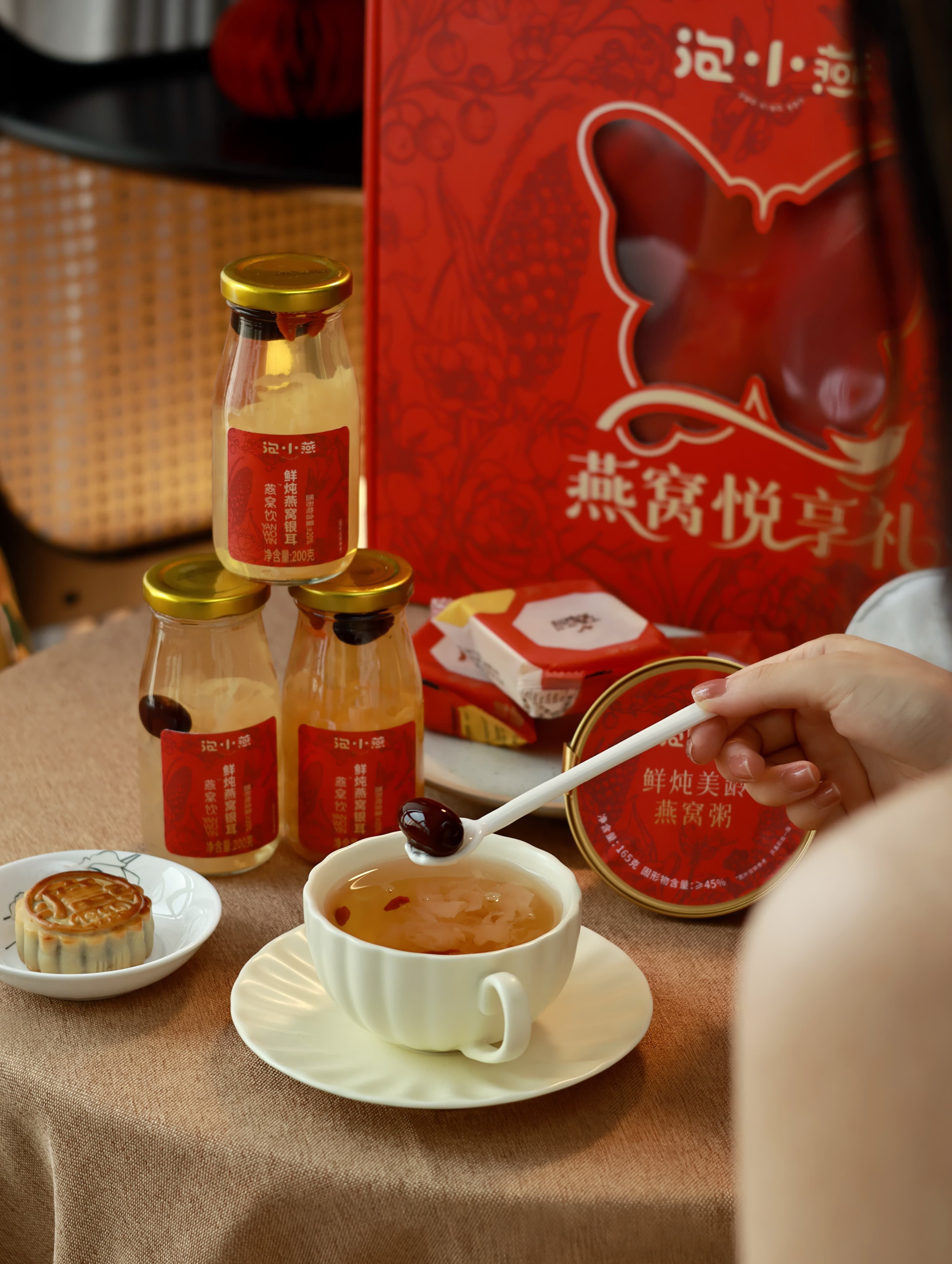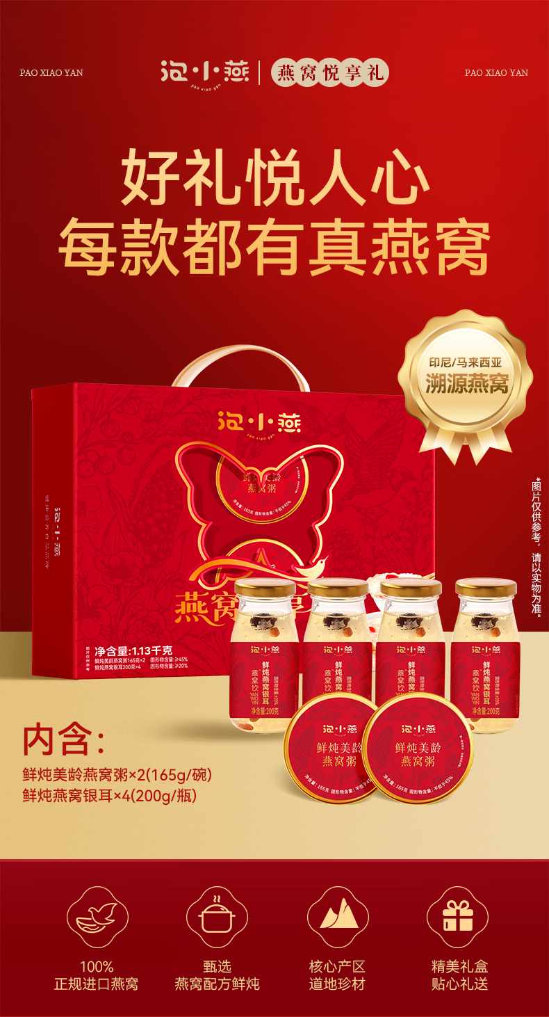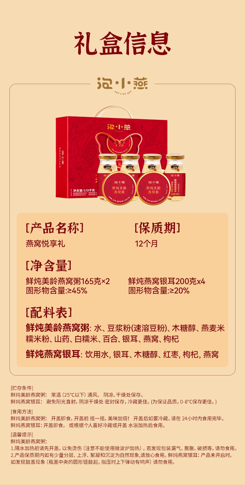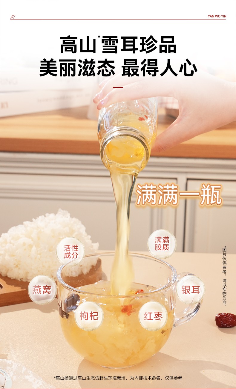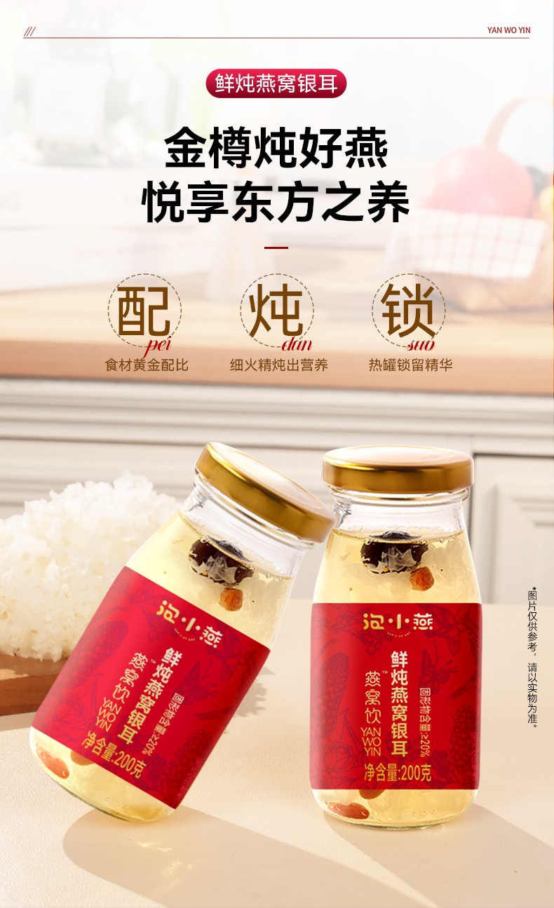 2.【中式经典配方,遵循食养之道】精选优质燕窝、银耳、红枣、枸杞鲜炖而成,玻璃瓶装食材统统看得见!