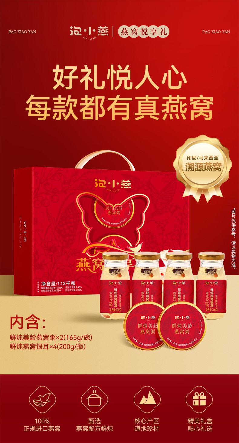 1.【甄选印尼&马来进口燕窝】世界燕窝看东南亚,优质燕窝营养,随时补元气,女性润养好食材。唾液酸被誉为胎儿发育的“脑黄金”,搭配银耳、红枣、枸杞,补充胶原蛋白、让皮肤更加饱满红润,滋养加倍