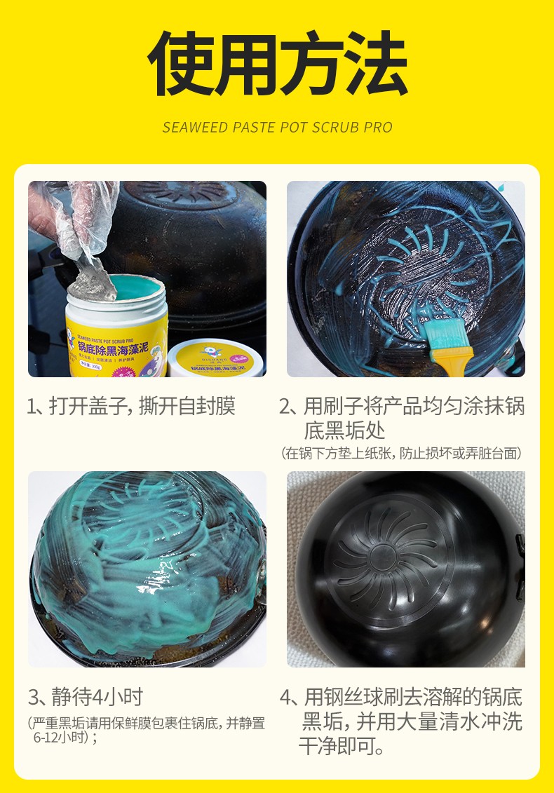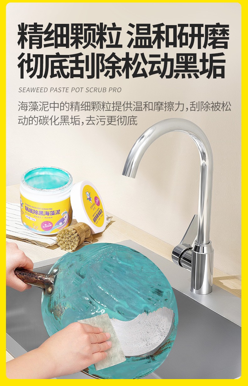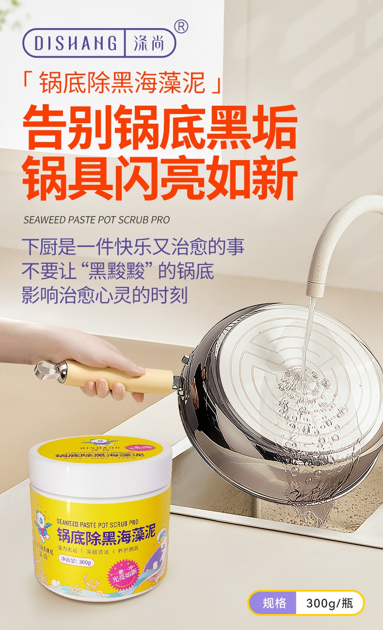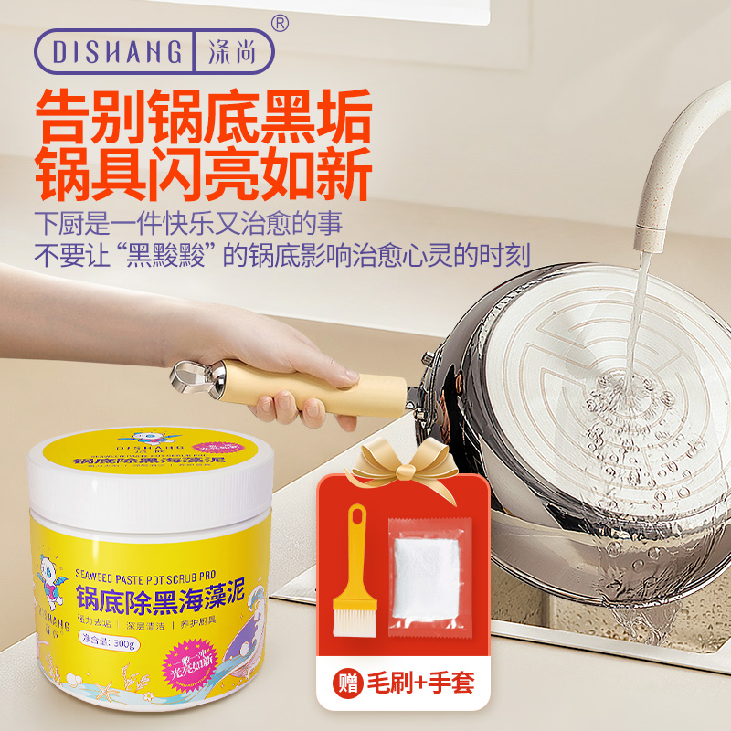 商品名称:涤尚锅底除黑海藻泥2瓶(赠刷子+手套)专门针对锅底黑垢的清理,海藻泥多孔结构,强力吸附锅底黑垢中的油脂和积碳,轻松瓦解顽固黑垢。