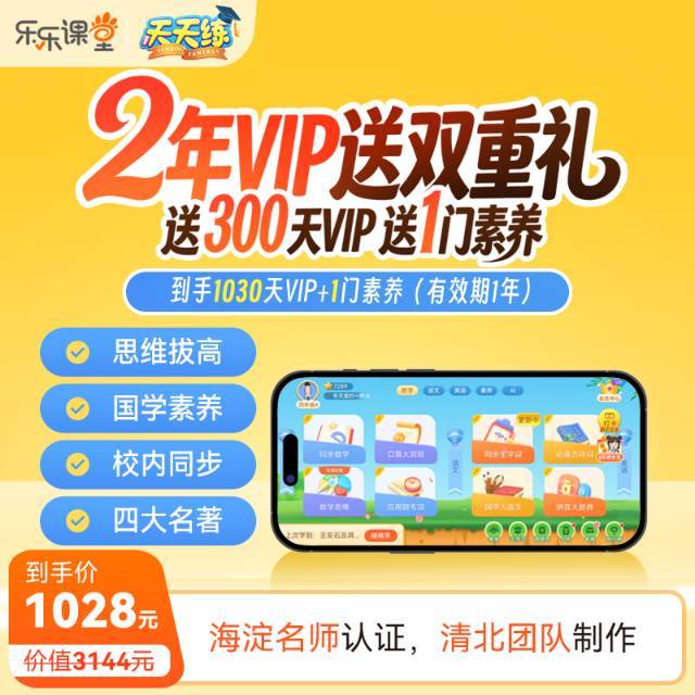 🌈天天练VIP两年卡四月送双重好礼❗️❗️ 🔥买2年VIP直接送300天VIP+1门素养课一年,到手1030天 📚清北名师打造的趣味动画课 🎒孩子主动学,不用催不用盯,解放老母亲❗️ 😄海淀妈妈们实力推荐的鸡娃神器